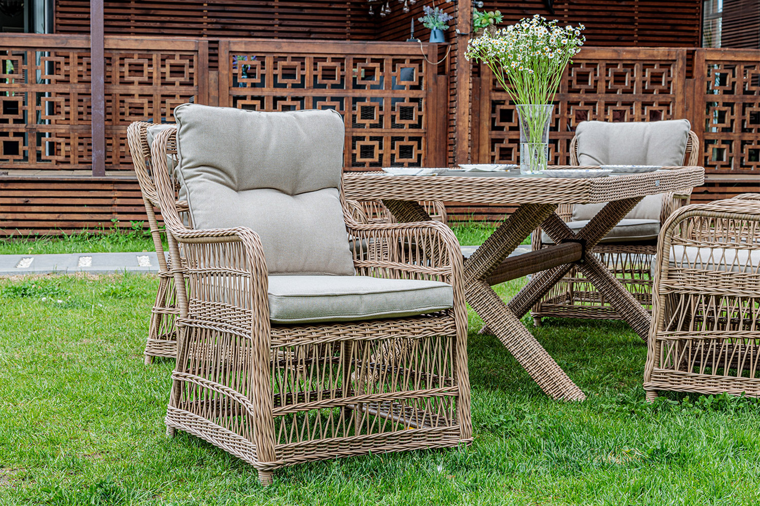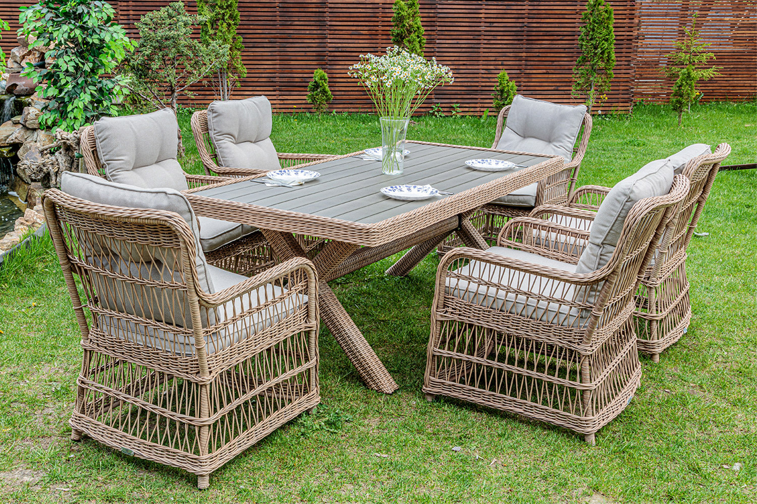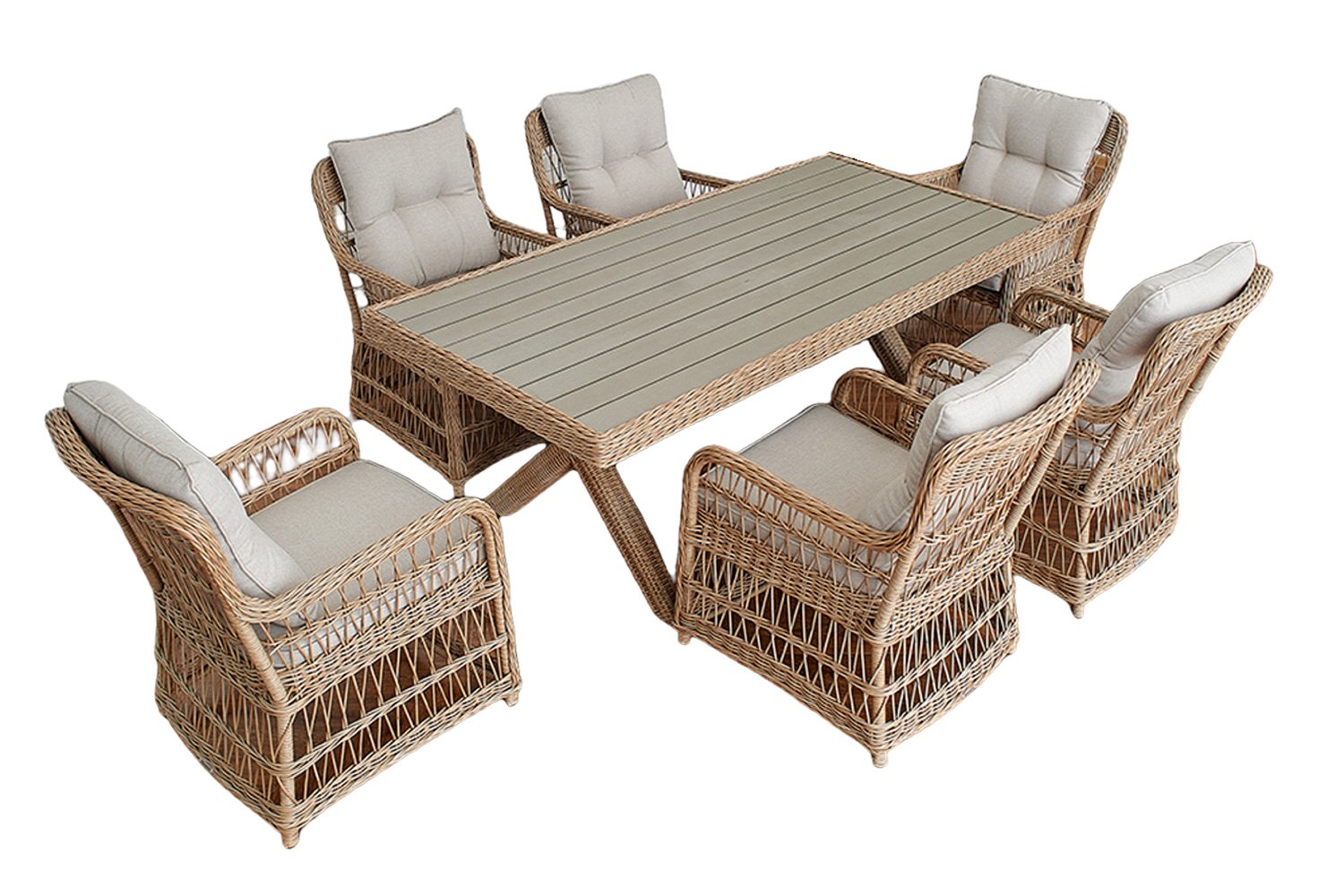 Размер кресел – 63х92х78 см, размер обеденного стола – 200х74х100 см. Все элементы мебели состоят из алюминия (каркас), искусственного ротанга и поливуда (оплетка, спинки кресел, подлокотники). Стол и каждое из кресел выдерживают нагрузку до 150 кг. Цвета оплеток – бежевый/серо-бежевый. Материалы, из которых состоит мебель, предназначены для использования на улице, поэтому отлично переживут несколько летних сезонов, даже если на улице будет дождь, влажность, или яркое солнце.