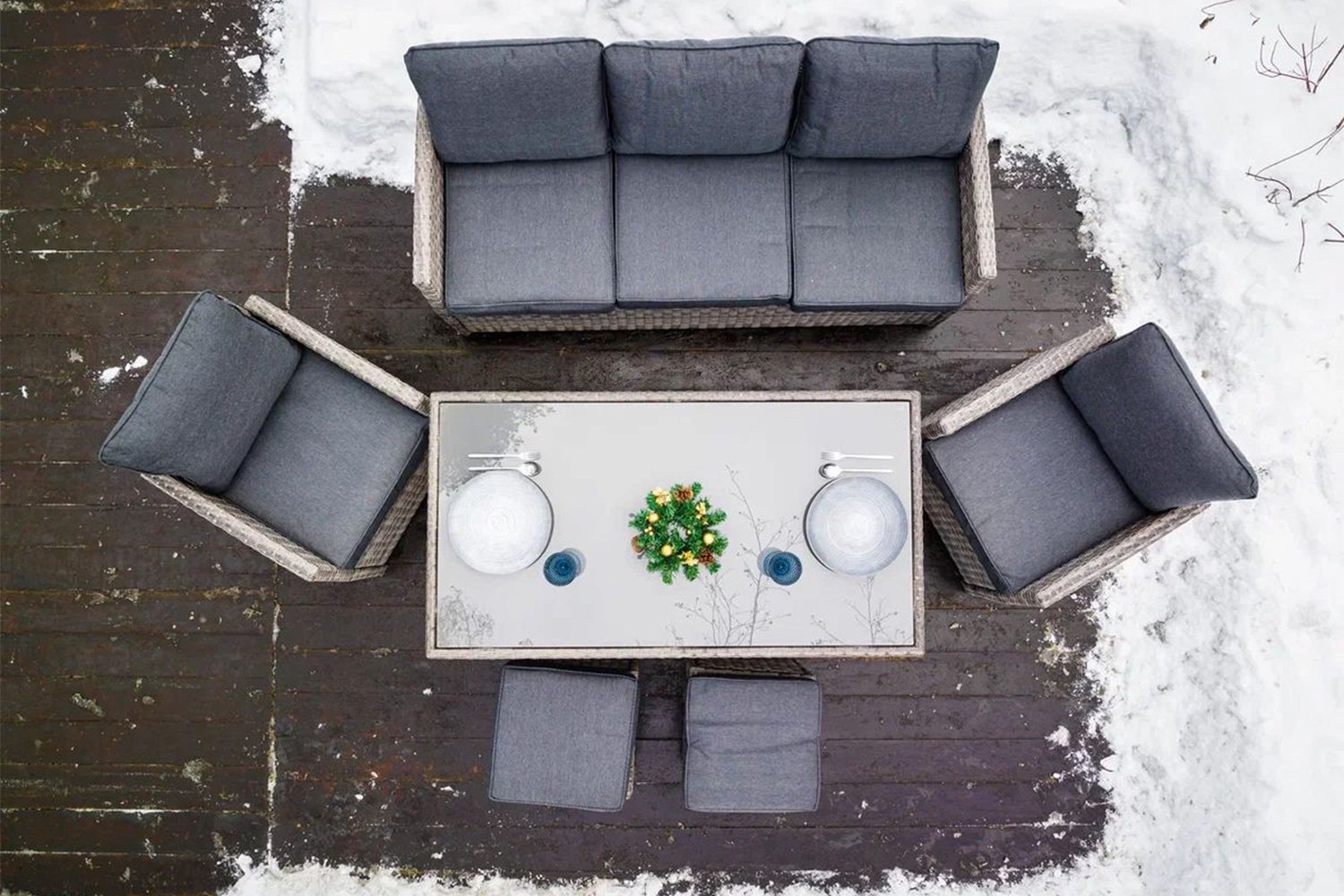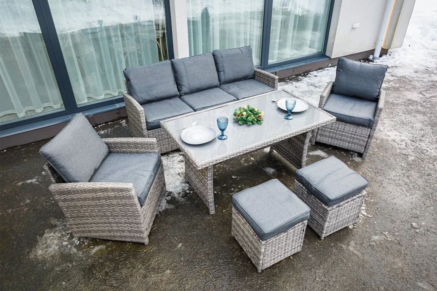 Комплект мебели подходит для использования на улице в зимние и летние периоды, в комплексе может разместиться до 7 взрослых человек. Теперь устроить дружеские или семейные посиделки на свежем воздухе не составит никакого труда, и все точно останутся довольны встречей.
